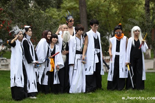 “慕斯凯麒动漫社”是一支主要由我院美术系学生组成的社团。为参加本届动博会, “慕斯凯麒动漫社”精心策划,认真编排,刻苦训练,于本学期初以Cosplay真人秀形式推出了一台动漫舞台剧——《死神》。该剧取材于时下最火热的三大动漫作品之一《死神》,经改编,最终成型。舞台剧分为两幕,第一幕讲的是死神之间的故事,男主角闯入尸魂界救助自己即将被处刑的朋友;第二幕讲的是死神与假面对峙,守护人类的安逸生活!经过种种磨难和惨烈的战斗,最后正义战胜邪恶!在舞台剧中,动漫社的同学们身着亲手制作的颠覆视觉的黑白服装,手持自己研制的武器装备,扮演各种人物,摆出各种造型,每招每式都精益求精,将剧中的各种有形和无形物质、各种思想情感、各种社会现象甚至抽象的概念以及剧中人物对现实和未来的乐观憧憬,都展现的一览无余。