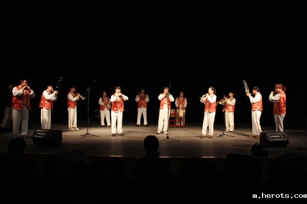 “休门吹歌”是河北省非物质文化遗产,已有300多年历史,但目前存在着群众了解少、传承人青黄不接的状况。作为河北省非物质文化遗产传承基地,我院深入挖掘地域特色文化,积极传承、弘扬和发展燕赵文化遗产,将“休门吹歌”这种民间艺术形式引入民族管乐合奏课课堂,并聘请有“吹破天”之称的“休门吹歌”传承人付锡芬老师亲自授课、排练,精心编排、传承创新这一独特的演奏形式,所排练的曲目《大家乐》、《放驴》曾在第四届“文华艺术院校奖——全国青少年民族乐器演奏比赛” 中摘得“文华奖鼓励奖”。