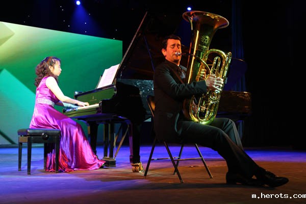 从小提琴二重奏《纳瓦拉》,到法国艺术家的钢琴合奏《映像》,再到我院钢琴老师伴奏、法国国立音乐舞蹈学院教授演奏的管乐《梦后》;从法国舞蹈艺术家充满激情的独舞《肢体的探索》,到我院舞蹈系师生的剧目展示《炫彩舞风》,再到男子群舞《万马奔腾》;从巴黎歌剧院女高音歌唱家演唱的抒情歌剧《图兰朵》选段《我死去的妈妈》,到法国女高音艺术家与我院音乐系教师合作的男女二重唱《为祖国干杯》;从浓浓的中国风到高雅的西洋韵,再到中法艺术家联手合奏、合唱,这场中西合璧的演出,堪称一场国际水准的视听盛宴。