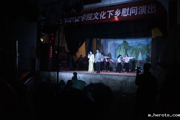 这是今年学院第二次组织文化下乡慰问演出了。下乡演出是苦差事,此次演出队经过三个多小时山路,到了演出地点现时搭台布景。山区夜晚清冷,演员们穿着薄薄的演出服依然激情饱满。彭蕙蘅老师激动地说,“看到老乡们冒雨观看演出,我们很感动,他们对文化的渴望也让我们深感惭愧,希望有更多的机会为山区群众演唱。”此次文化下乡,既让广大农民群众感受到改革开放的时代韵律,营造出和谐、稳定、发展的氛围,同时又使学院师生真正深入到鲜活的基层生活中感受社会发展新变化,丰富自身舞台表演经验。