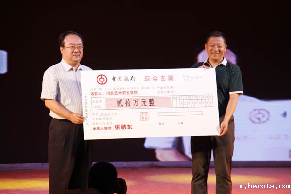 仪式上,我院戏曲科1986届毕业生张敬东老师为“校友奖学金”捐赠人民币20万元,用于资助优秀或经济困难的教师和学生。
