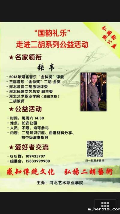 日前,为让更多的人了解和掌握二胡演奏技巧,传承和普及二胡艺术,我院音乐系青年教师张韦发挥专业特长,利用业余时间创办了免费二胡班,为省会市民及二胡爱好者提供了交流学习的平台。