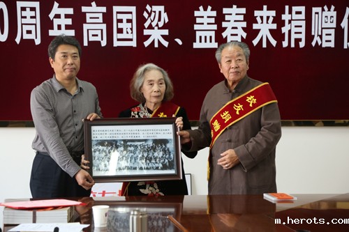 高国梁、盖春来老师把多年来珍藏的建校之初的珍贵老照片17张以及《生命之美盖春来》画册5本赠送学校。庞院长代表学院接受捐赠并为两位老人颁发了捐赠荣誉证书。