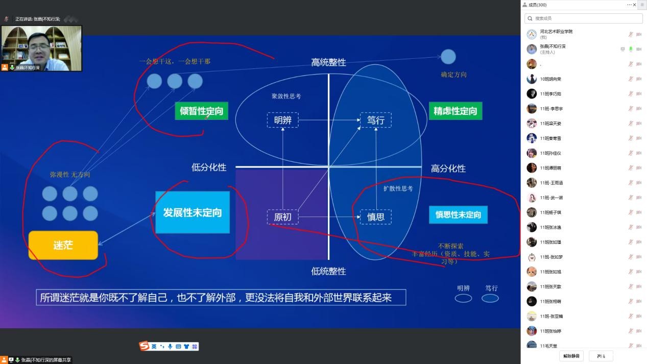 本次讲座的目的在于唤醒学生生涯发展意识,积极主动探索自我,提高学生生涯决策能力,通过对学生自我探索和外部探索指导,帮助学生获取职业目标。张老师在讲座中分析了当代大学生面临的生涯发展困惑,包括生涯觉醒差、认知层次低和探索行动少等,这导致同学们无论对自我还是外部世界(专业、职业和未来生活方式)都缺乏认知,进而形成生涯迷茫,导致一系列发展性问题。如何解决这些困惑,张老师讲解了澄清未来发展愿景(澄清目标)、激活学习内部动机(从他控到自控)、明确学业发展阶段模式(五阶段、四模式和生涯发展计划表)和战略性生涯规划(生涯规划获奖模型)等方式,帮助同学们迅速适应并有效规划大学学习工作和生活。