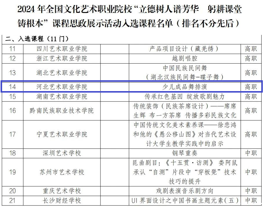 近日,全国文化艺术、旅游职业教育教学指导委员会发布了2024年全国文化艺术、旅游职业院校“立德树人谱芳华 躬耕课堂铸根本”课程思政展示活动入选课程名单,18luck快乐彩申报的《少儿成品舞排演》课程成功入选。