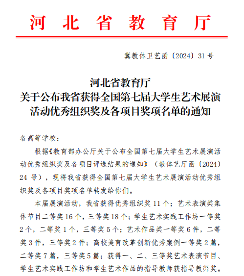 全国大学生艺术展演活动每三年举办一届,是我国教育系统举办的规模最大、规格最高、影响最广的艺术实践活动。第七届大艺展以“厚植家国情怀,涵养进取品格”为主题,共有31个省(区、市)、新疆生产建设兵团和香港特别行政区、澳门特别行政区共计1761部作品获奖,其中河北省获奖作品70部。