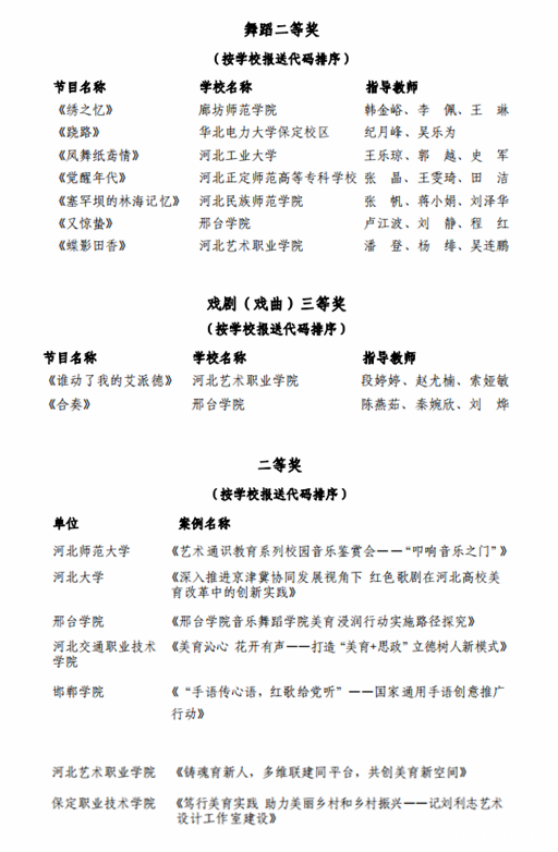 近日,河北省教育厅公布了我省获得全国第七届大学生艺术展演活动优秀组织奖及各项目奖项名单。18luck快乐彩在本次大艺展中喜获优异成绩:报送的原创舞蹈作品《蝶影田香》获全国艺术表演类舞蹈二等奖;原创戏剧作品《谁动了我的艾派德》获全国艺术表演类戏剧三等奖;美育案例《铸魂育新人,多维联建同平台,共创美育新空间》获全国高校美育改革创新优秀案例二等奖。
