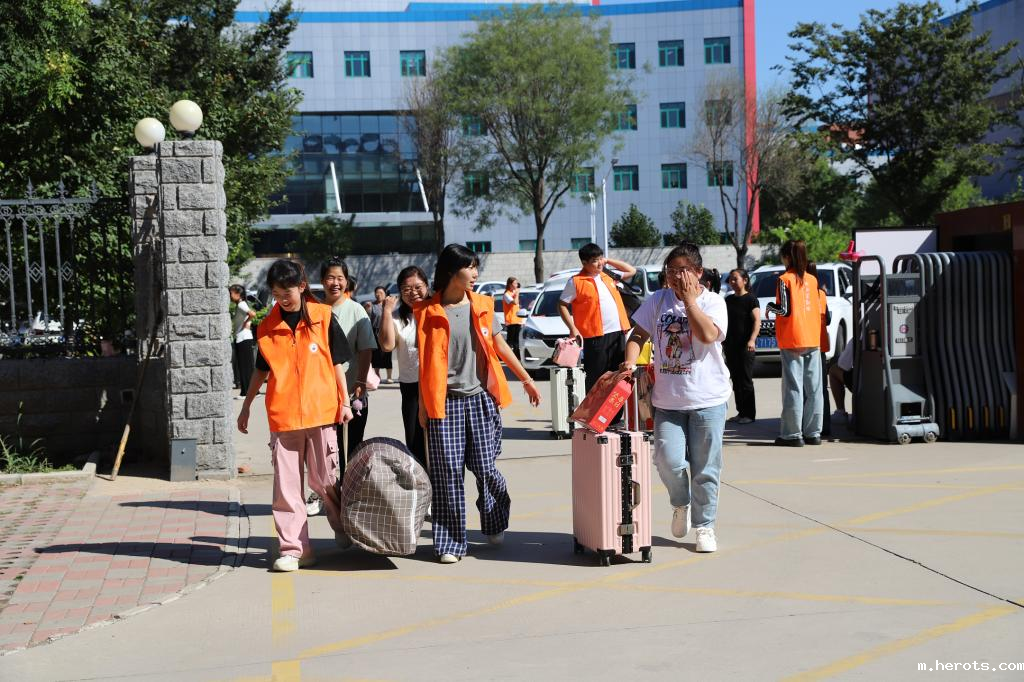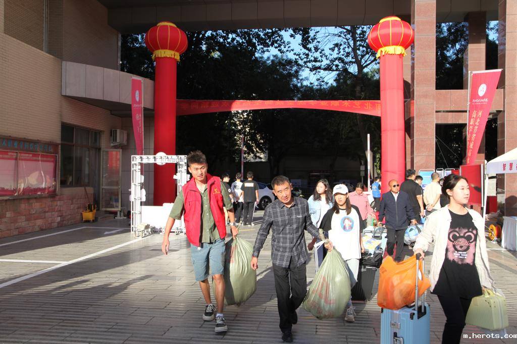 大院里,身着红、蓝、黄马甲的校学生会、青协、自律委员会的志愿者们高举引导牌,“一对一”“点对点”为新同学们答疑解惑,热情地帮助新手和家长提行李、作导航,带领大家有序办理报到手续。
