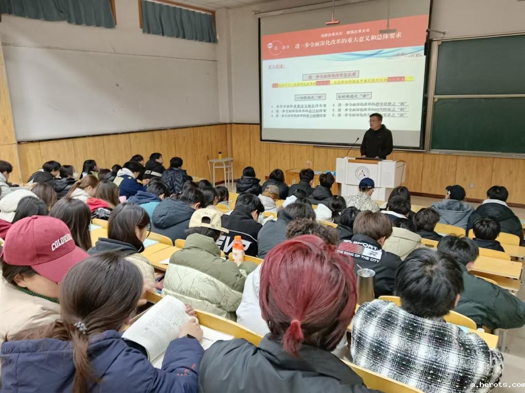 学院党委书记蒋国新12月18日、20日分别为舞蹈、音乐、美术三系学生讲授思政课,宣讲二十届三中全会精神。蒋书记回顾了党的十一届三中全会以来的历届重要会议,围绕深刻理解党的二十届三中全会的基本情况及新时代全面深化改革的重大成果、深入学习领会习近平总书记在党的二十届三中全会上的重要讲话精神、全面准确理解《决定》提出的进一步全面深化改革重大举措等方面,系统阐释全面深入领会党的二十届三中全会精神的重要性和必要性,引导莘莘学子深刻领会和把握进一步全面深化改革的主题、重大原则和重大举措等重要课题。