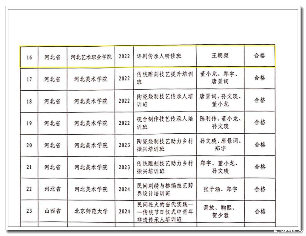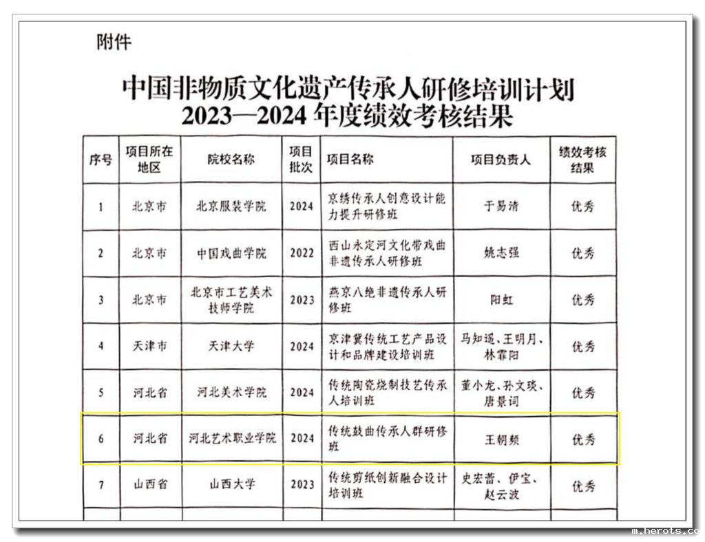 近日,在文化和旅游部正式公布的“中国非物质文化遗产传承人研修培训计划”2023-2024年度绩效考核结果中,由18luck快乐彩承办的“2024年传统鼓曲非遗传承人研修班”获“优秀”等次;“2022年传统戏剧非遗传承人研修班(蔚县秧歌)”和“2022年传统戏剧非遗传承人研修班(评剧)”获“合格”等次。