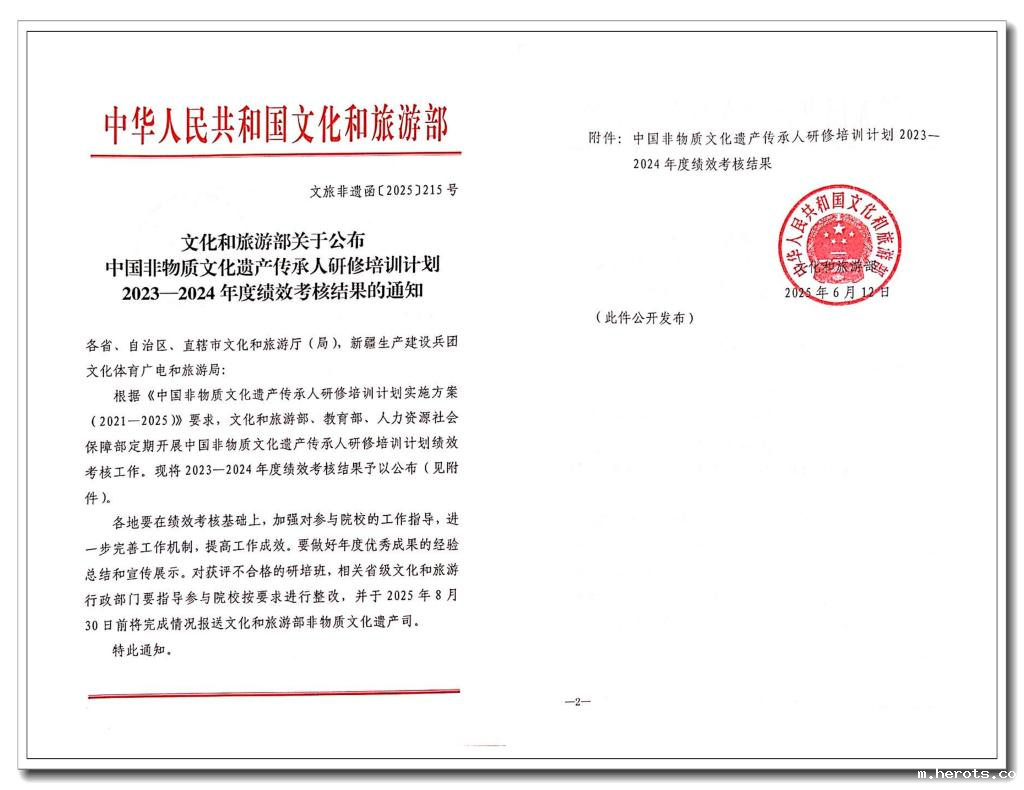 此次绩效考核由文化和旅游部、教育部、人力资源和社会保障部联合组织,旨在对中国非物质文化遗产传承人研修培训计划前一阶段的工作成果进行全面总结与科学评估。 “2024年传统鼓曲非遗传承人研修班”获得“优秀”评价,充分体现了我院在该项目组织管理、课程设置、教学实施、成果转化等方面的显著成效和高质量办学水平,也是对我院在非遗传承人培养领域工作成效的权威认可。