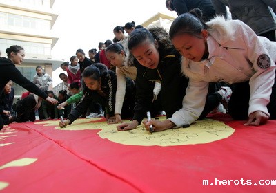 昨日下午4点,18luck快乐彩本部的1000多名学生以班为单位摆成35个方阵,35名学生代表把4583.4元捐助款放入捐款箱内。