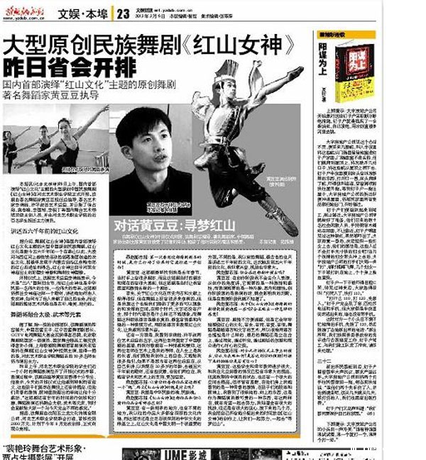 黄豆豆:这些学生和青年教师进步很大,和我在元旦前看的情况已经有非常大的提高,但离我期待中演员的状态,也还有一个很大的空间去提高。但尽管有差距,在他们身上我能看到的是一种青春的激情,在孩子们的肢体和眼神上,我看到了很单纯的、向上的东西,这是作为舞蹈演员最可贵的一种东西,有这两样在,就有希望一起去努力。我知道会有很大的挑战,但还是有很大的信心,接下来的几个月,我会把自己所有能分配出来的时间放在《红山女神》的创作上,让我们一起努力,一起去“寻梦红山”。