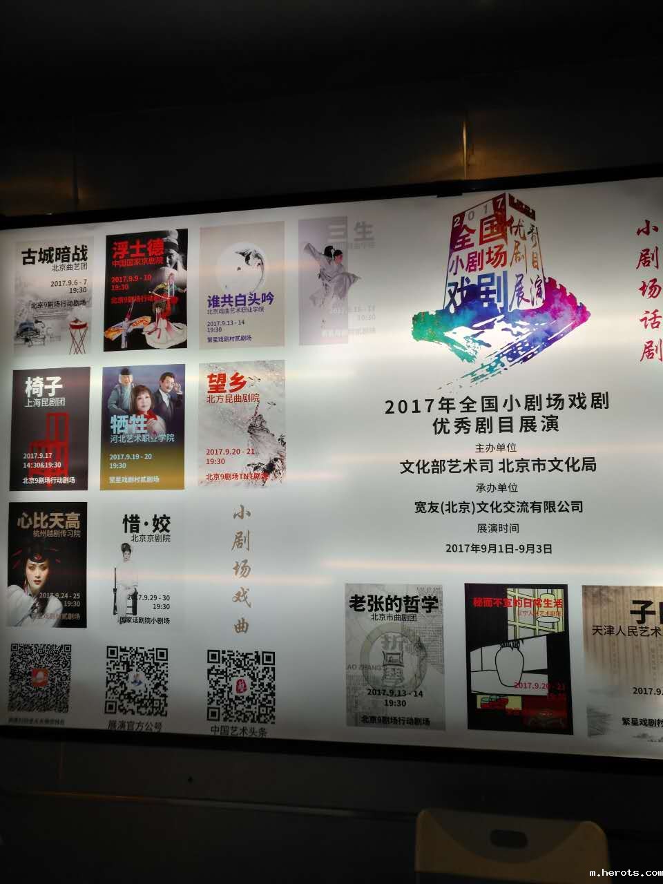 2017年全国小剧场戏剧优秀剧目展演活动由文化部艺术司、北京市文化局主办,21部优秀参演作品从9月1日至30日在国家话剧院小剧场、国话先锋剧场等陆续上演。反映了近年来小剧场戏剧创作发展的整体水平,展 现了小剧场戏剧工作者积极探索、勇于创新的不懈追求。