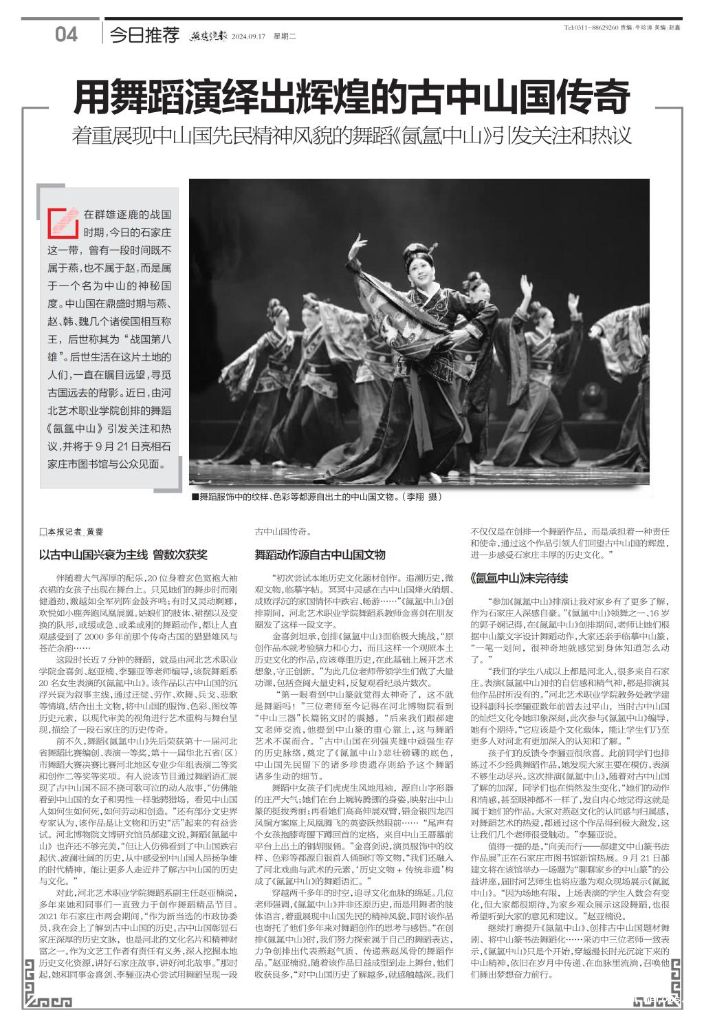 穿越两千多年的时空,追寻文化血脉的绵延。几位老师强调,《氤氲中山》并非还原历史,而是用舞者的肢体语言,着重展现中山国先民的精神风貌。同时该作品也寄托了他们多年来对舞蹈创作的思考与感悟。“在创排《氤氲中山》时,我们努力探索属于自己的舞蹈表达,力争创排出代表燕赵气质、传递燕赵风骨的舞蹈作品。”赵亚楠说,随着该作品日益成型到走上舞台,他们收获良多,“对中山国历史了解越多,就感触越深。我们不仅仅是在创排一个舞蹈作品,而是承担着一种责任和使命,通过这个作品引领人们回望古中山国的辉煌,进一步感受石家庄丰厚的历史文化。”