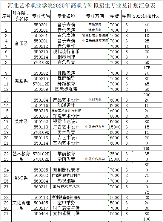 郝端勇:2025年学院统招面向省内外专科提前批、普通专科批招生,共有750个招生计划,包含音乐表演类、音乐教育类、舞蹈类、美术与设计类、学前教育、表(导)演类、服装表演类、广播影视节目制作、服务类和文物修复与保护等20余个专业及方向,详见下表。