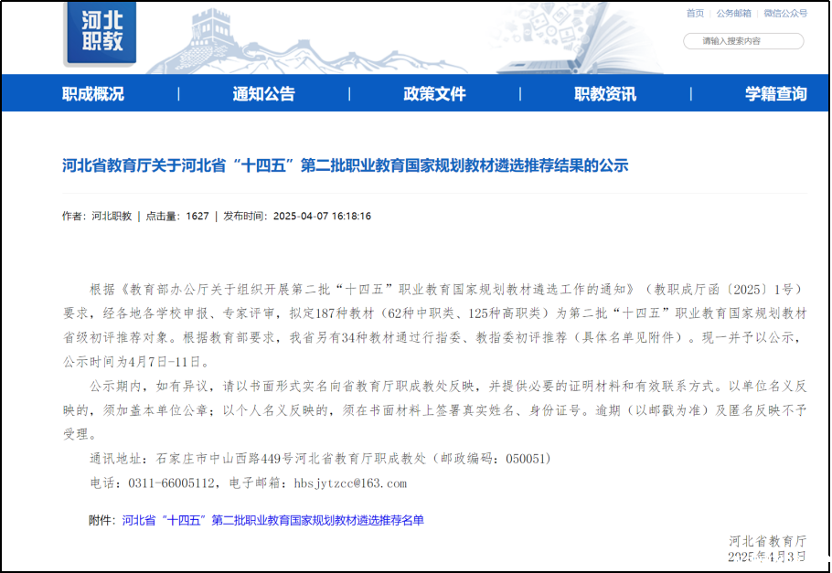 我院积极响应国家职业教育教材建设号召,严格依据《教育部办公厅关于组织开展第二批“十四五”职业教育国家规划教材遴选工作的通知》和《河北省教育厅关于组织开展第二批“十四五”职业教育国家规划教材遴选推荐工作的通知》要求,精心组织开展了教材推选工作。在推选过程中,学院秉持严谨态度,按照既定程序,从众多教材中精心挑选出4本教材进行申报。这些教材紧密对接职业标准与岗位需求,深度契合专业人才培养目标,充分展现学院各专业的特色与优势。最终3本教材成功入选省级公示名单。