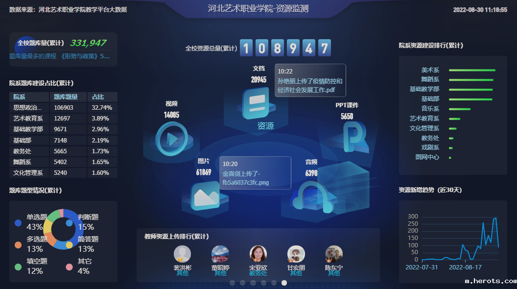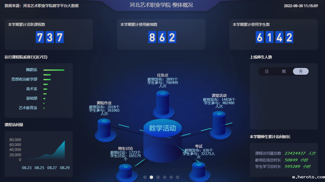 学院开学前夕还召开了院级教学督导在线专项会议,强化在线教学质量管理与督导,传达2022年秋季学期教学督导听课安排。同时,教务处专门设置联络员对接教学督导与系部,通过“教学大数据”分析平台,对课程数据、教学运行、出勤记录等量化数据进行评估,并通过学院领导、教学督导、教务处、各系部四方的内外联动,实现对全校授课教师及学生全覆盖的督导管理。评价结果、意见建议通过数字化教学平台中“移动听评课”功能集中反馈,实现了教学过程督导与管理的动态化、精准化,有效促进了后续教学的持续改进,提升了课堂教学实效。
