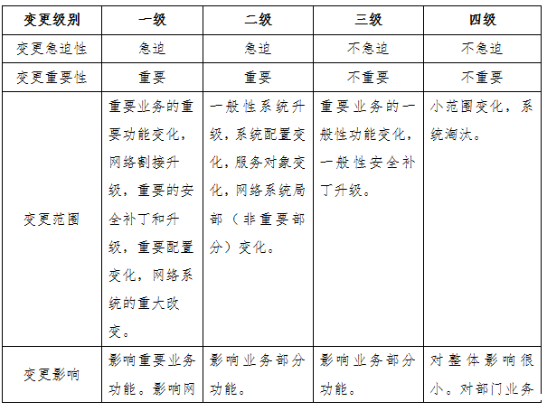 3、针对周期性的同一变更工作(三级和四级),须形成统一、标准的变更方案。在变更过程中可简化对此类变更工作的审批工作。