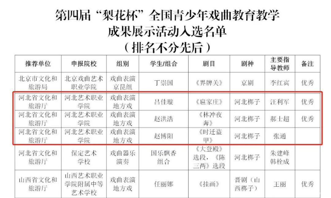 今年3月,文化和旅游部启动第四届“梨花杯”全国青少年戏曲教育教学成果展示活动。经过层层筛选推荐,我院戏剧系学生吕佳璇的《扈家庄》、赵洪浩的《林冲夜奔》、赵博阳的《时迁盗甲》剧目被河北省文化和旅游厅推荐入选文化和旅游部第四届“梨花杯”全国青少年戏曲教育教学成果展示活动,其中吕佳璇的河北梆子《扈家庄》和赵洪浩的河北梆子《林冲夜奔》被文化和旅游部评为优秀剧目。
