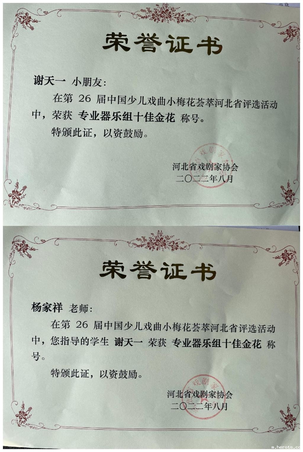 日前,由中国戏剧家协会主办的第二十六届“中国少儿戏曲小梅花荟萃河北省专业器乐组”结果公布,18luck快乐彩戏剧系2021 级京剧音乐专业学生谢天一荣获专业器乐组“十佳金花”称号(指导教师:杨家祥)。