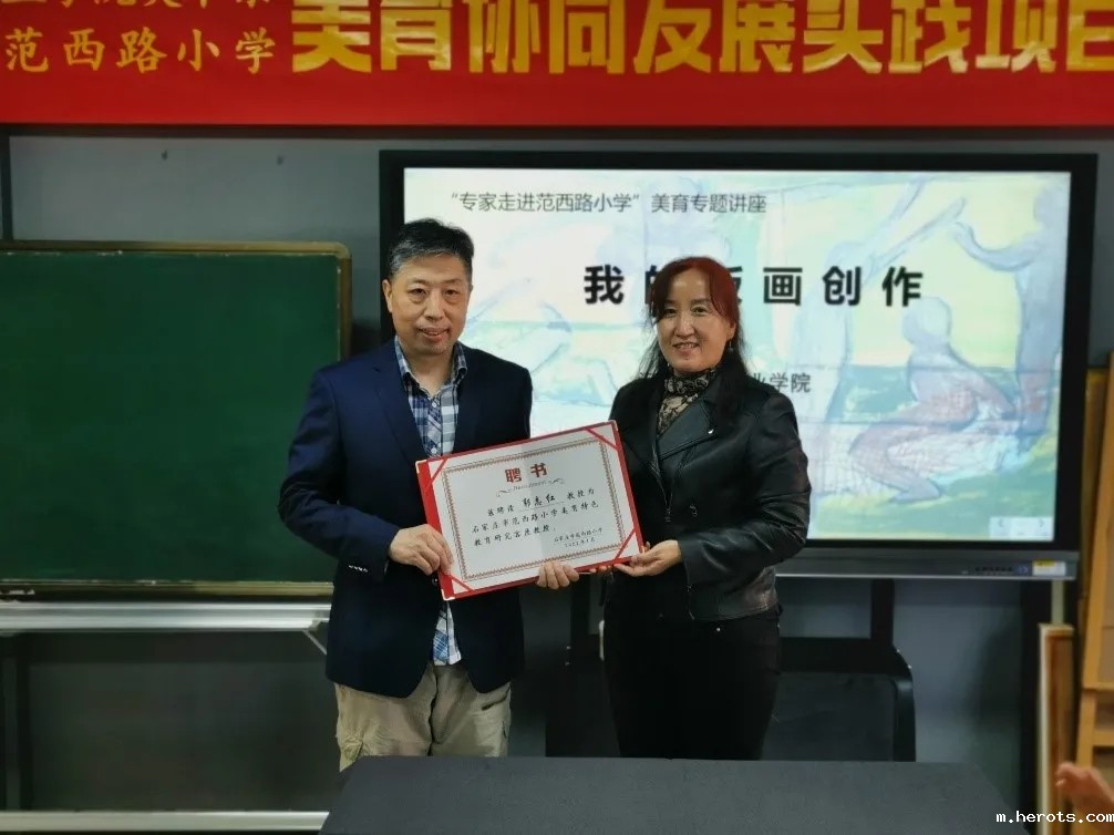 美术系主任关金国代表双方学校签署了共建协议,美术系教授郭志红被聘为范西路小学客座教授。